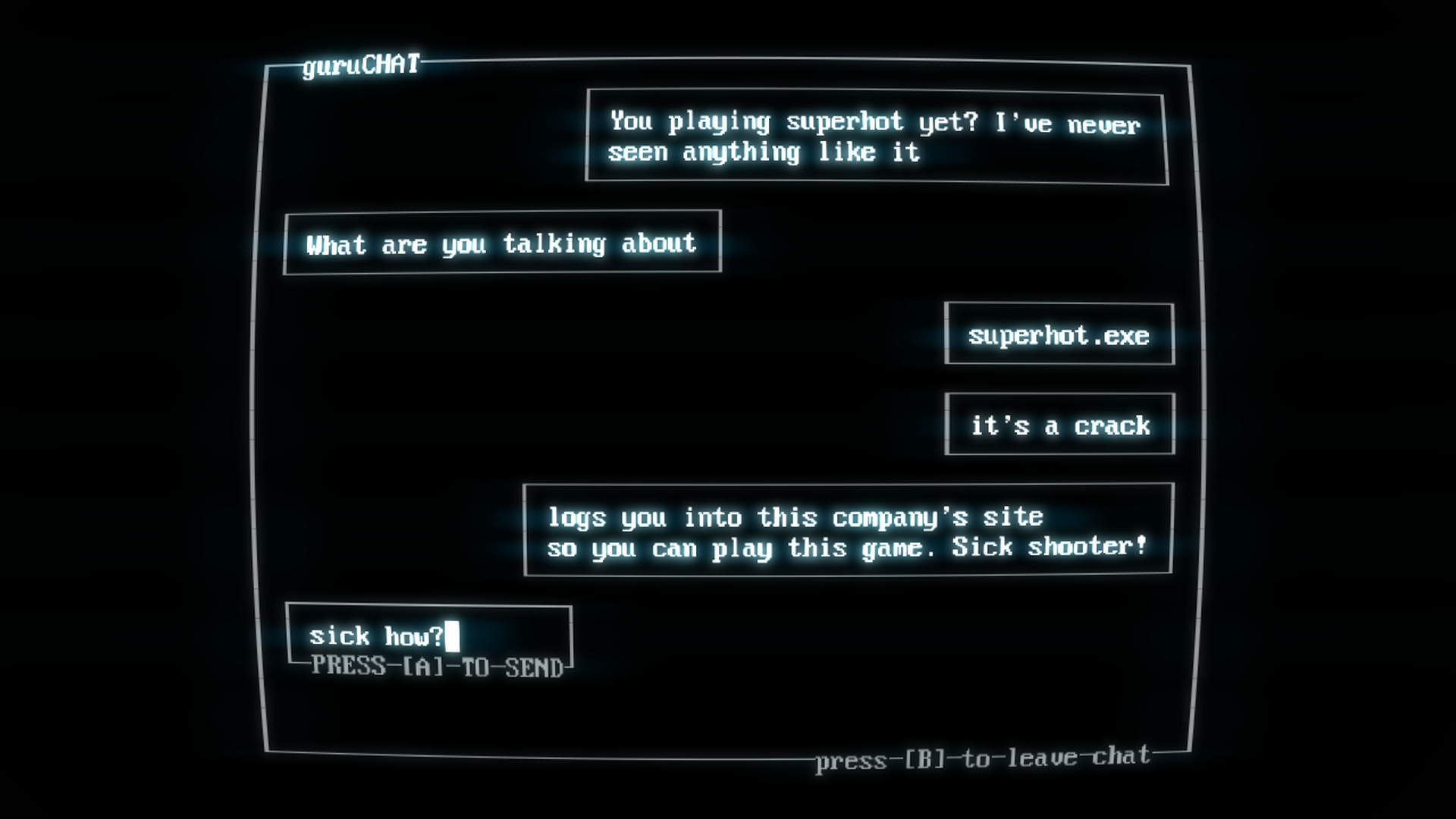 SUPERHOTia voisi kuvailla sanalla erikoinen. Se on aina valikoitaan myöten jotain aivan muuta. Pelin käynnistyessä ruudulle avautuu vanhaa DOS-käyttöjärjestelmää muistuttava tekstisivu. Kaikki on kovin mystistä ja SUPERHOT.exeä painaessa ei oikein tiedä mitä tulee tapahtumaan.